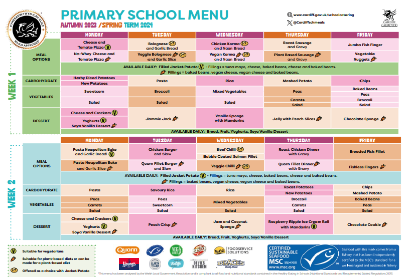 The Welsh Government roll out of free school meals for primary school aged children is nearly complete with Year 6 being offered free school meals as of 3rd June 2024. Parents/ Carers must book meals in advance of the school day using parentpay (please speak to the school administrators if you are having difficulty with this). The current menu can be found by following the link below. If your child has any food intolerances/ allergies that aren't already recorded in school please contact the administrators as soon as possible.